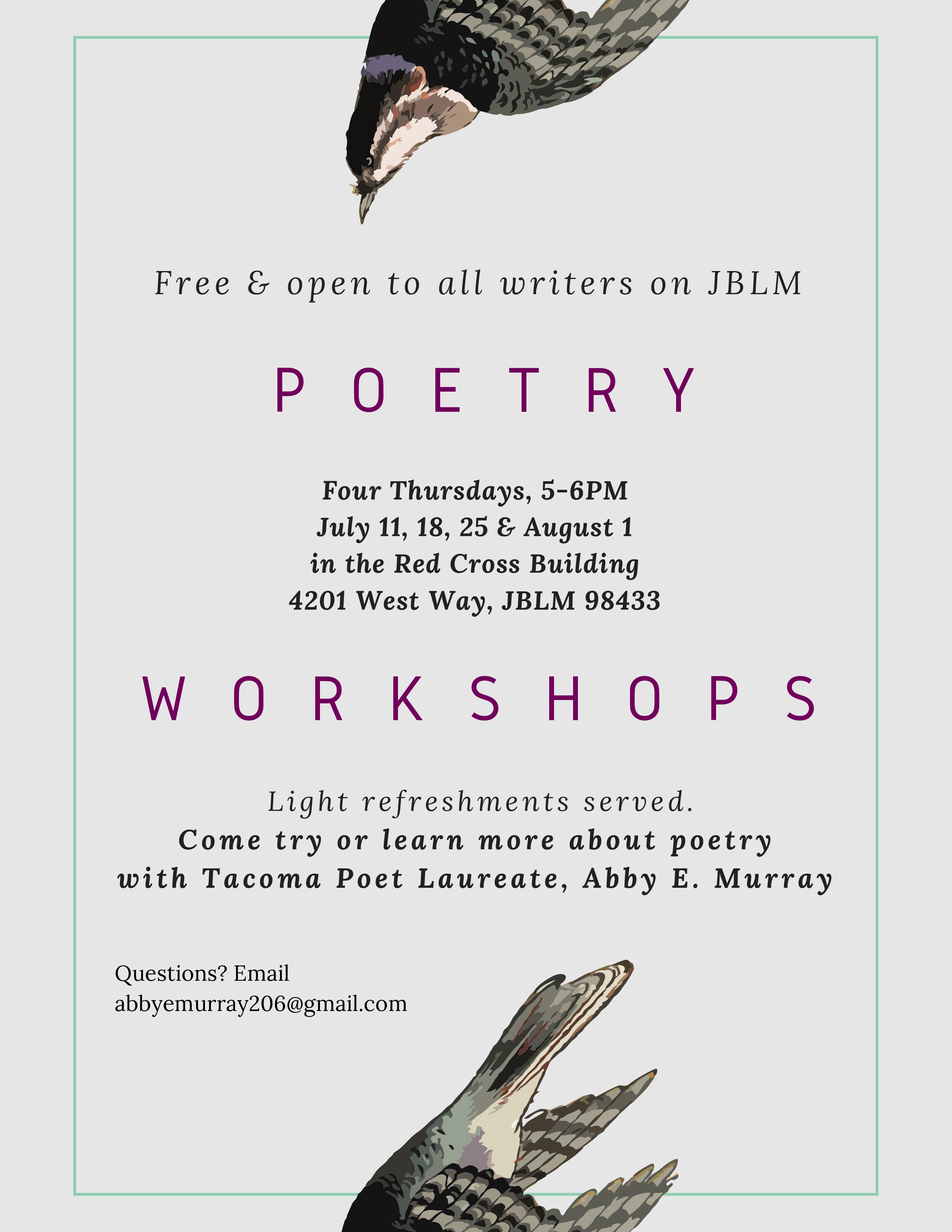 Join me for the second of four summer poetry workshops on JBLM, in the Red Cross Building (4201 West Way). No fee or registration required. Park either next to the Red Cross Building or in the lot across the street.