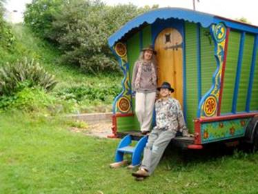 Peter and Donna Thomas are book artists, who live and work in Santa Cruz, California but also travel around the country as “Wandering Book Artists” in their “Gypsy Wagon Artist’s Bookmobile.” Their journey to becoming wandering book artists began in the 1970s, when, dressed like Robin Hood and Maid Marion, they sold blank books at the Renaissance Pleasure Faires in California. They constructed a small gypsy wagon to use as their booth, a colorful and charming vehicle that they always dreamed of taking on a road trip around the country. But pulling that wagon was a white-knuckle adventure…it wobbled and rocked like a ship at storm. That wagon served them well for many years, until 2008 when it burned in a wildfire, leaving only a pile of melted metal and memories. They cleaned up the wreckage then, with the assistance of Raucina Cabinets in Midpines, CA, they started building a new and more roadworthy trailer, modeled after a “Reading” wagon, one of the many styles of horse drawn homes made for Romany travelers in England during the late nineteenth and early twentieth centuries.