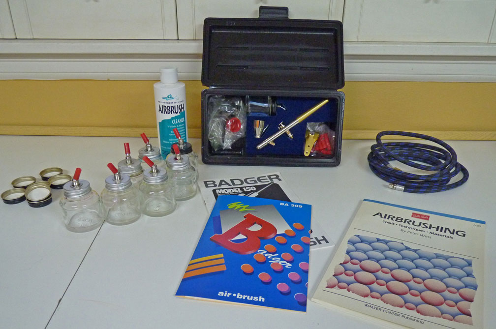 Badger 150 Airbrush used only a few times. All accessories that came with it are included plus the book, Airbrushing by Peter West, seven 2 oz glass bottles with metal adapters and a bottle of airbrush cleaner. I just posted this on Craigslist THEN I remembered this list! Here is one photo. See the Craigslist link for more photos.