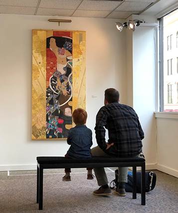 Peter & Miles Stanley view a painting by Lynette Charters at the 950 Gallery. Photo by Laraine Wade