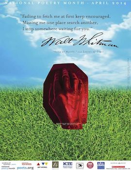 The 2014 poster, designed by Chip Kidd, features a bronze of Walt Whitman's hand along with the lines "Failing to fetch me at first keep encouraged, / Missing me one place search another, / I stop somewhere waiting for you." from Whitman's "Song of Myself." It’s on the official 2014 NPM page herehttp://www.poets.org/page.php/prmID/98
