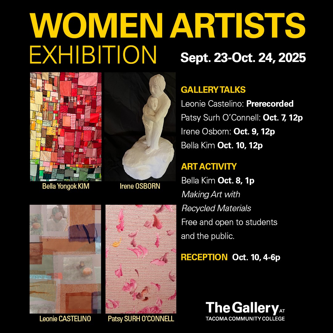 [Women Artists Exhibition Sept. 23 - Oct. 24, 2025. Gallery Talks: Leonie Castelino, prerecorded. Patsy Surh O'Connell, Oct. 7, 12p. Irene Osborn, Oct. 9, 12p. Bella Kim, Oct. 10, 12p. Art Activity: Bella Kim, Oct. 8, 1p. Making art with recycled materials. Free and open to students and the public. Reception: Oct. 10, 4-6p]