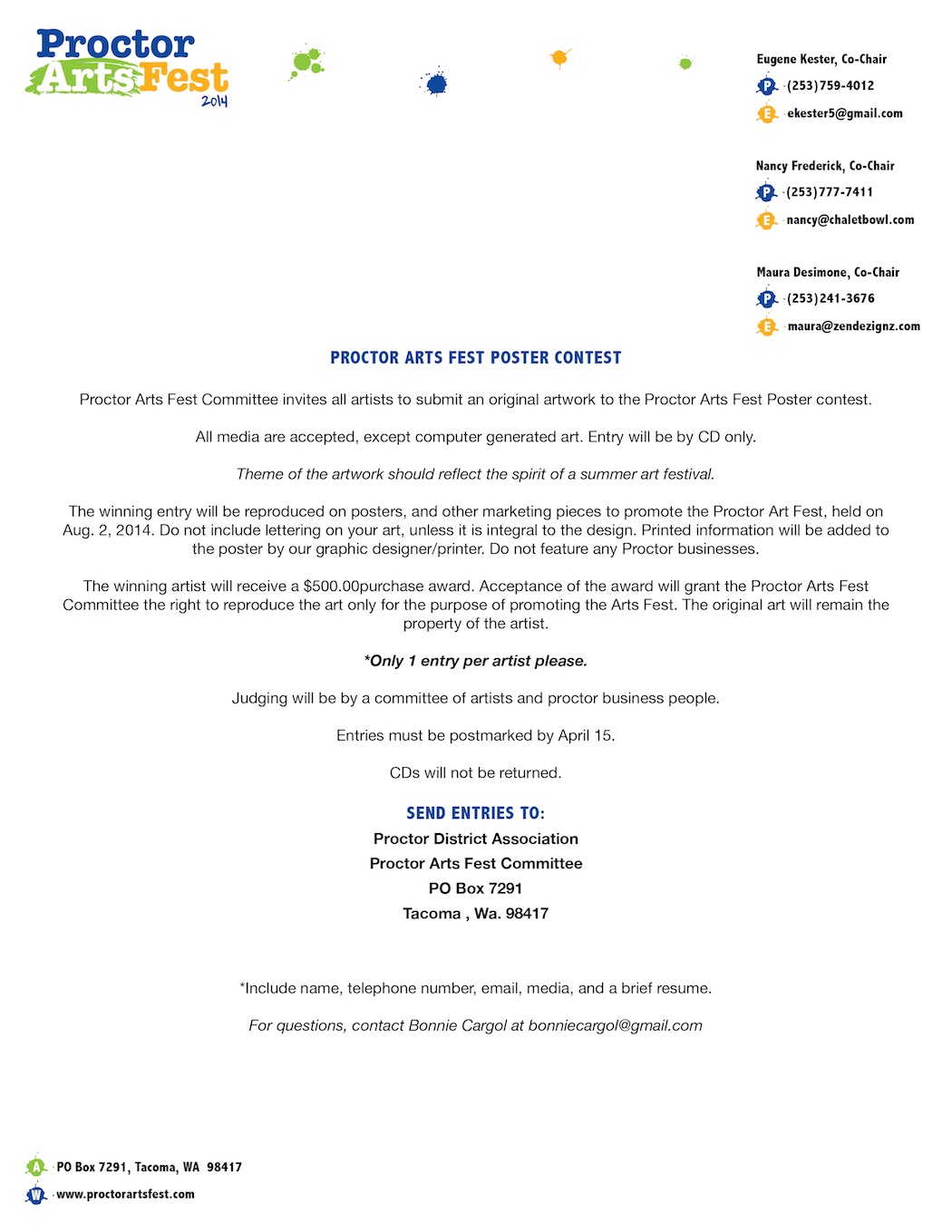 Only two more weeks to get your poster contest entries to us. Wouldn’t you like to win $500? If so, carefully read the attachment, follow the directions and send us your interpretation of a summer art fair.