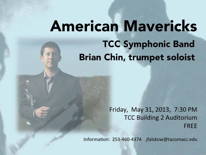 The TCC Symphonic Band performs its final concert of the 2012-13 academic year. Brian Chin (trumpet) is our featured soloist, playing R.R. Bennett's Elegy for Miles Davis. The program celebrates American mavericks, and features music that pushed boundaries and explores new ways of expression.