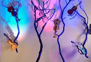 "Fiddle Woods" will be a mixed-media installation by Tacoma artist Becky Frehse that includes assemblages of natural wood branches, musical instruments, found objects, ceramic parts, and lighting to suggest a forest engaged in a musical concert through color, gesture, and light. A thick, gestural forest with vertical and diagonal branches and LED spotlights to create a dynamic effect at night, this installation will also be filled with unplayable string instruments, becoming ornamented and grouped to offer a visual medley of treats for the viewer to discover.