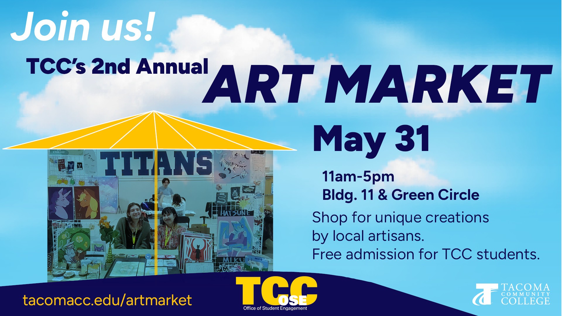 Join us Saturday, May 31 in the Tacoma Community College Building 11 Student Center and Campus Commons to shop creations by local artists, including students! Free admission, everyone welcome!