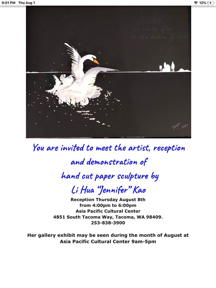 It is a pleasure to invite everyone for the reception of wonderful paper cut artist Lihua Kao to APCC Gallery August Artist.