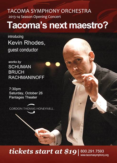 TACOMA, WA-Called "a highly accomplished conductor" by Opernwelt, American conductor Kevin Rhodes is the third of four finalists for music director to appear in concert with the Tacoma Symphony Orchestra. Mr. Rhodes will conduct the opening concert of the 2013-2014 Season, taking place at 7:30 p.m. Saturday, October 26 in the Pantages Theater, 901 Broadway. The concert will open with William Schuman's American Festival Overture, followed by Bruch's Violin Concerto No. 1, featuring Svend Rønning as soloist. Rachmaninoff's Symphony No. 2 will conclude the program. Gordon Thomas Honeywell and The Roberson are the concert sponsors. For tickets, $19 to $62, call 591-5894, toll free at 800-291-7593, or visit www.tacomasymphony.org<http://www.tacomasymphony.org>.