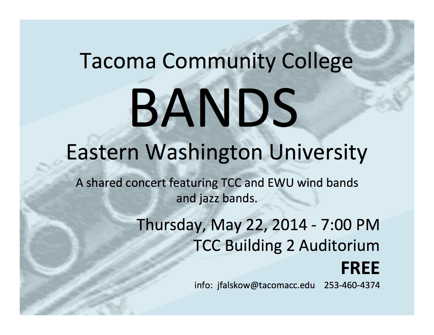 TCC Symphonic Band and Jazz Band are happy to host the Eastern Washington University Wind Ensemble, Jazz Band, and Code Red (pep band). This shared concert will feature TCC and EWU ensembles, with the main focus on the EWU ensembles.