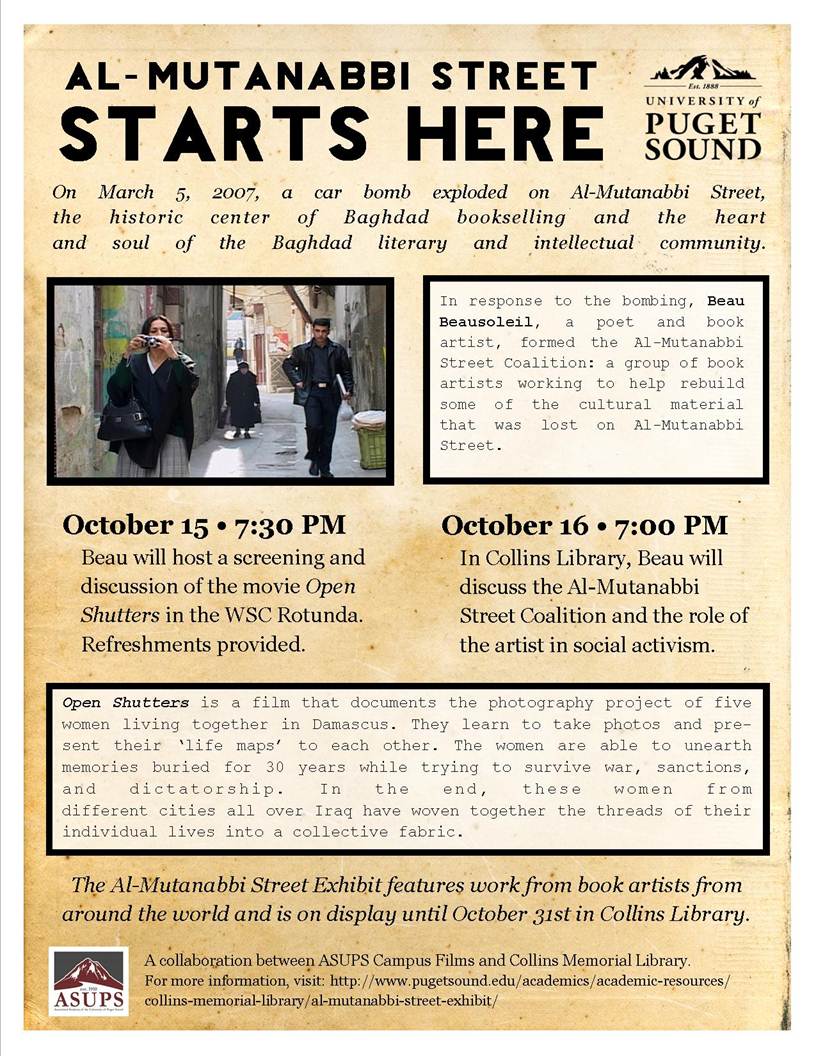 October 16: 7 - 8:30 pm. 2nd Floor Archives, Collins Memorial Library, Presentation by Beau Beausoleil on the Al-Mutanabbi Street project with artists Bonnie Thompson Norman and Laura Russell.