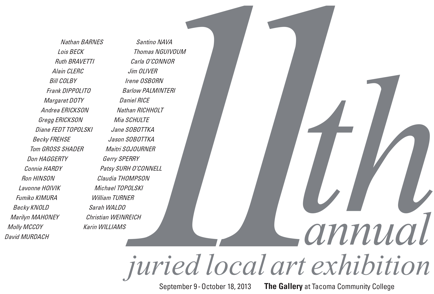 Work by 41 local artists will be on display in the Gallery at Tacoma Community College during the 11th Annual Juried Local Art Exhibit, Sept. 9 – Oct. 18, 2013. A reception will be held in The Gallery Sept. 19, 4-7 p.m.