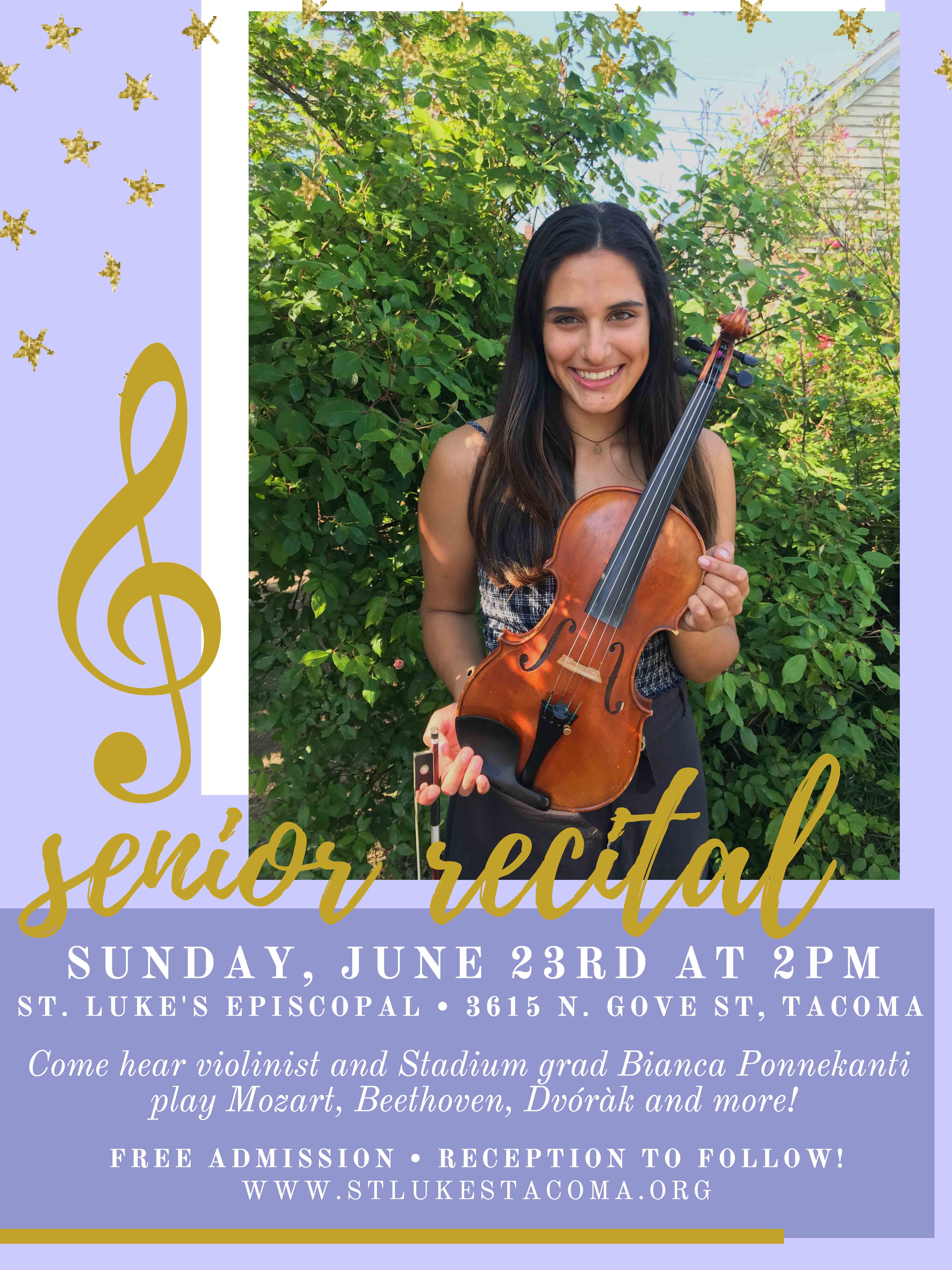 Come to Bianca Ponnekanti's FREE Senior Recital violin concert!Bach, Beethoven, Dvorak, Mozart and more, all in the beautiful space of St. Luke's Episcopal. Rosemary Ponnekanti (former TNT arts writer) accompanies on piano and bass.There's a string group for the Mozart, plus tango, Celtic and more.Celebrate with this Stadium grad before she heads off to Boston University.