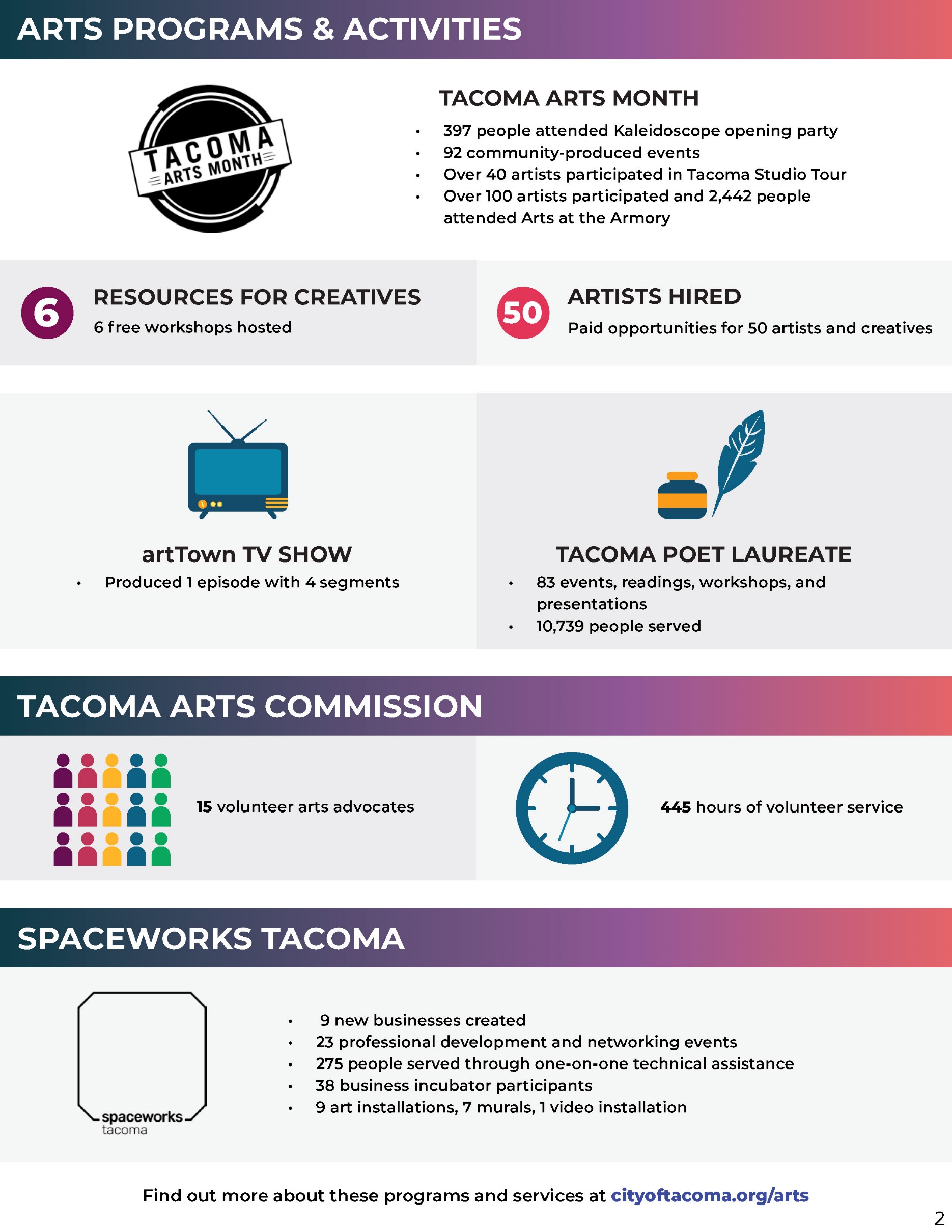 Find out more about how the City of Tacoma's Office of Arts & Cultural Vitality serves our community at cityoftacoma.org/artshttp://www.cityoftacoma.org/arts and tacomacreates.orghttps://www.tacomacreates.org/.