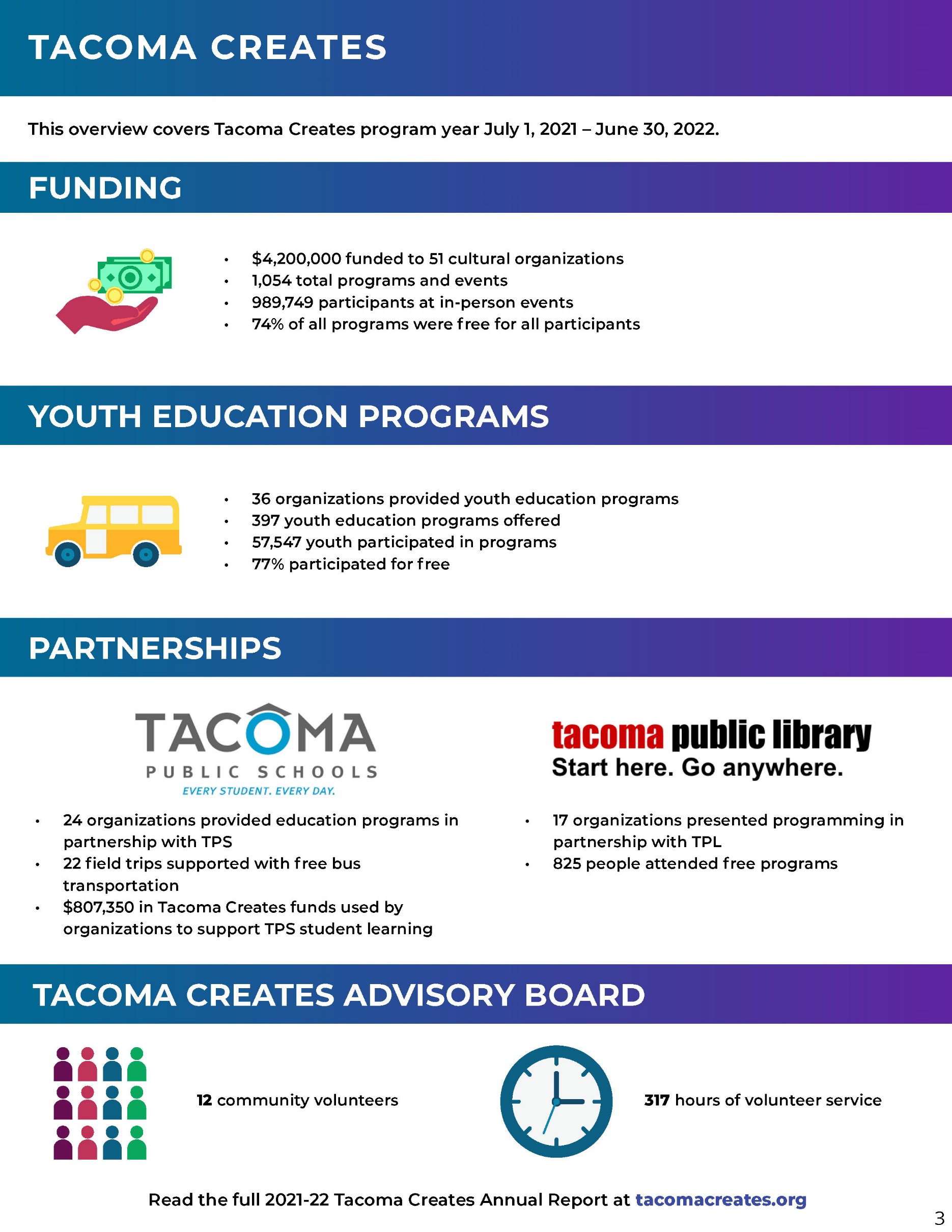 Our 2022 Annual Reporthttps://cms.cityoftacoma.org/CEDD/TacomaCulture/arts/TA_TAC_22YearInReview_FullReport.pdf illustrates the far-reaching impacts the City's investments in the cultural sector have on our community. Below is an overview; you can read the full 2022 Annual Report herehttps://cms.cityoftacoma.org/CEDD/TacomaCulture/arts/TA_TAC_22YearInReview_FullReport.pdf.
