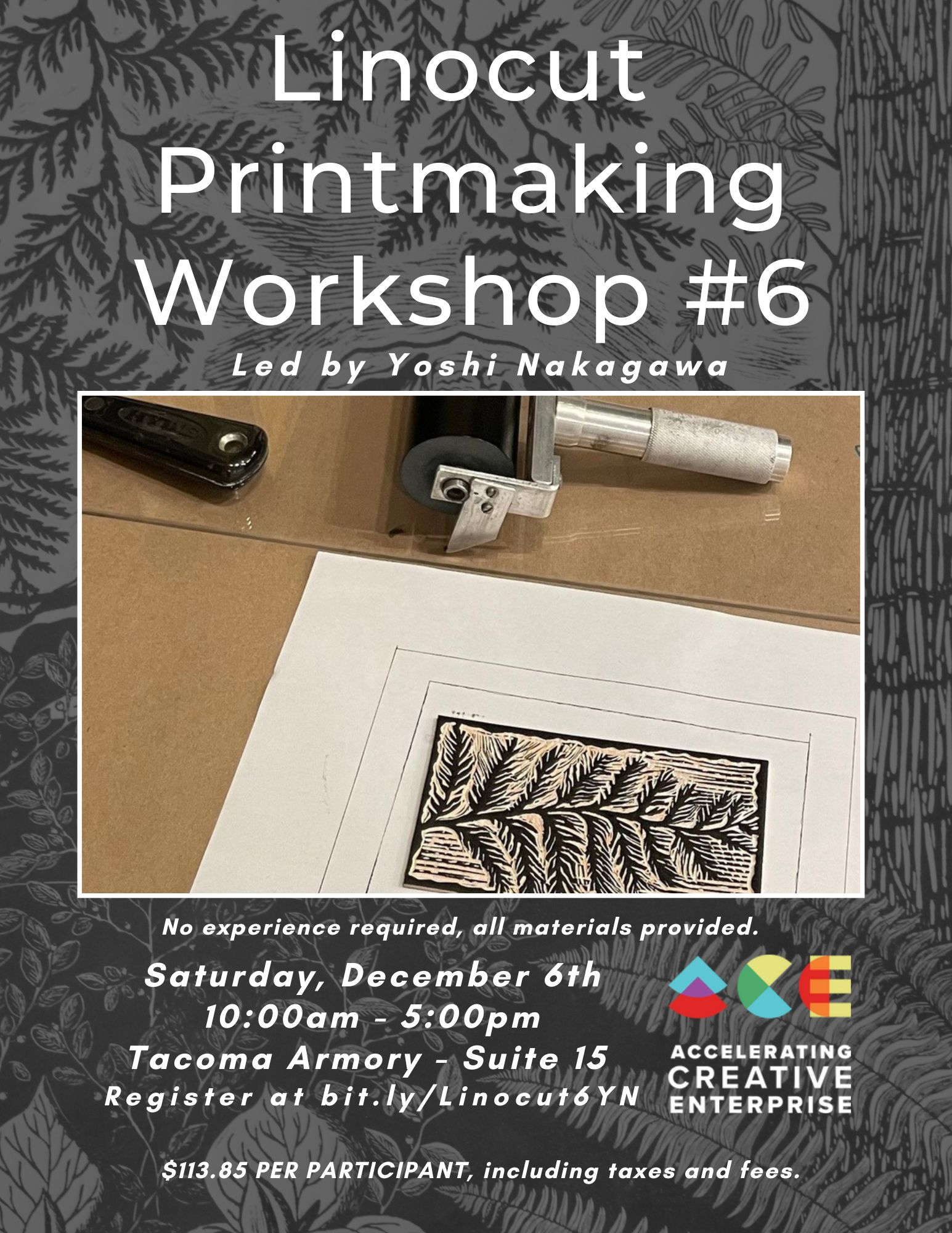 Registration is open for Linocut Printmaking Workshop at the Tacoma Armory! Tacoma printmaker, Yoshi Nakagawa, will guide you through the relief process of transferring your image onto 4”x6” linoleum blocks, carving, and hand printing proofs with oil-based ink and two washi (mulberry paper) prints to take home. We can add color with water-based pigments. This is a technique you can do at home once you have the materials and even print on textiles and fabric. Supported by ACE Accelerating Creative Enterprise, more info & register here.