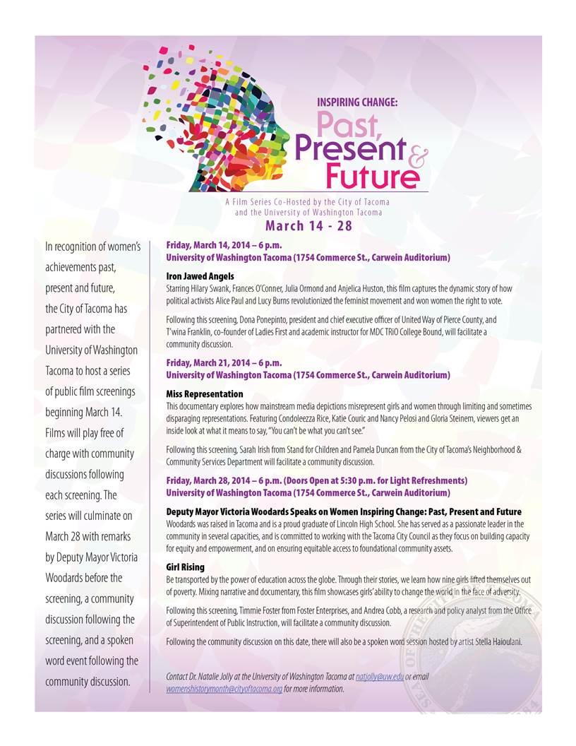The festival finale will be held on Friday, March 28th where Deputy Mayor Woodards will be making remarks and introducing the final film, "Girl Rising". This event will also be held in the Carwein Auditorium at UWT, starting at 5:30pm, and is free and open to the public, and light refreshments will be served! Following the film screening there will also be a community discussion and spoken word event.