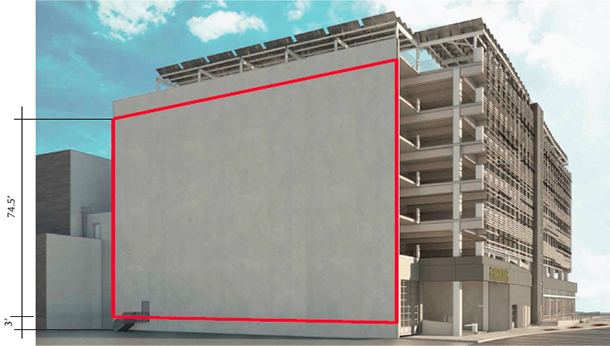 [Architectural rendering of Beaverton Central District Garage and available wall for artwork.]